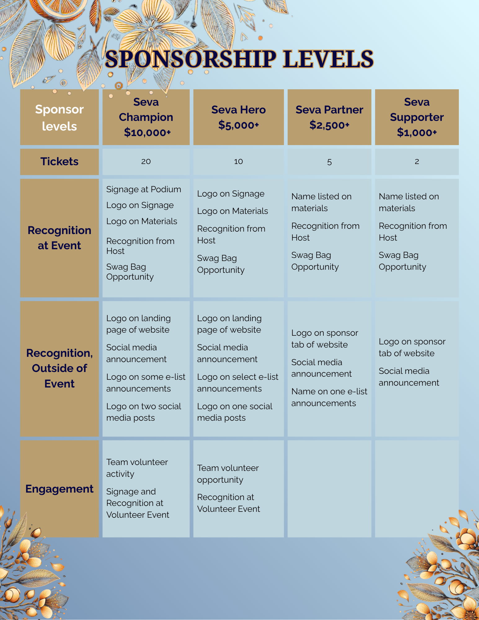 At Seva Collective, our mission is rooted in the spirit of seva (selfless service) and it’s only through the generosity of sponsors like you that we can continue to uplift and nourish our communities. Your support enables us to provide essential resources, expand our outreach, and foster dignity, hope, and connection for those who need it most.
